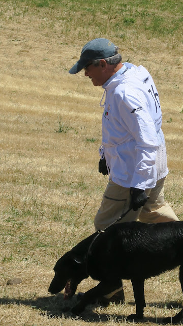 Middle - Quanah went through the first pond and caught a part of the rectangle pond then came out of it heading towards the flyer. An adjustment by the dog and over to his bird.